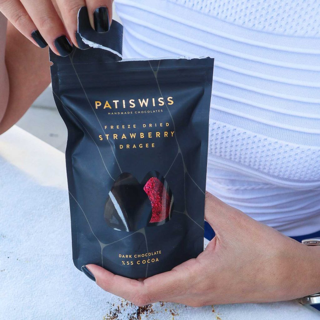 Hiçbir besin değeri kaybolmadan en yüksek teknolojiler ile dondurularak kurutulmuş çileklerin, Patiswiss’in %55 kakao oranlı %100 gerçek özel formül bitter çikolataları ile tamamen el yapımı olarak üretilmiş çilek drajeleri.