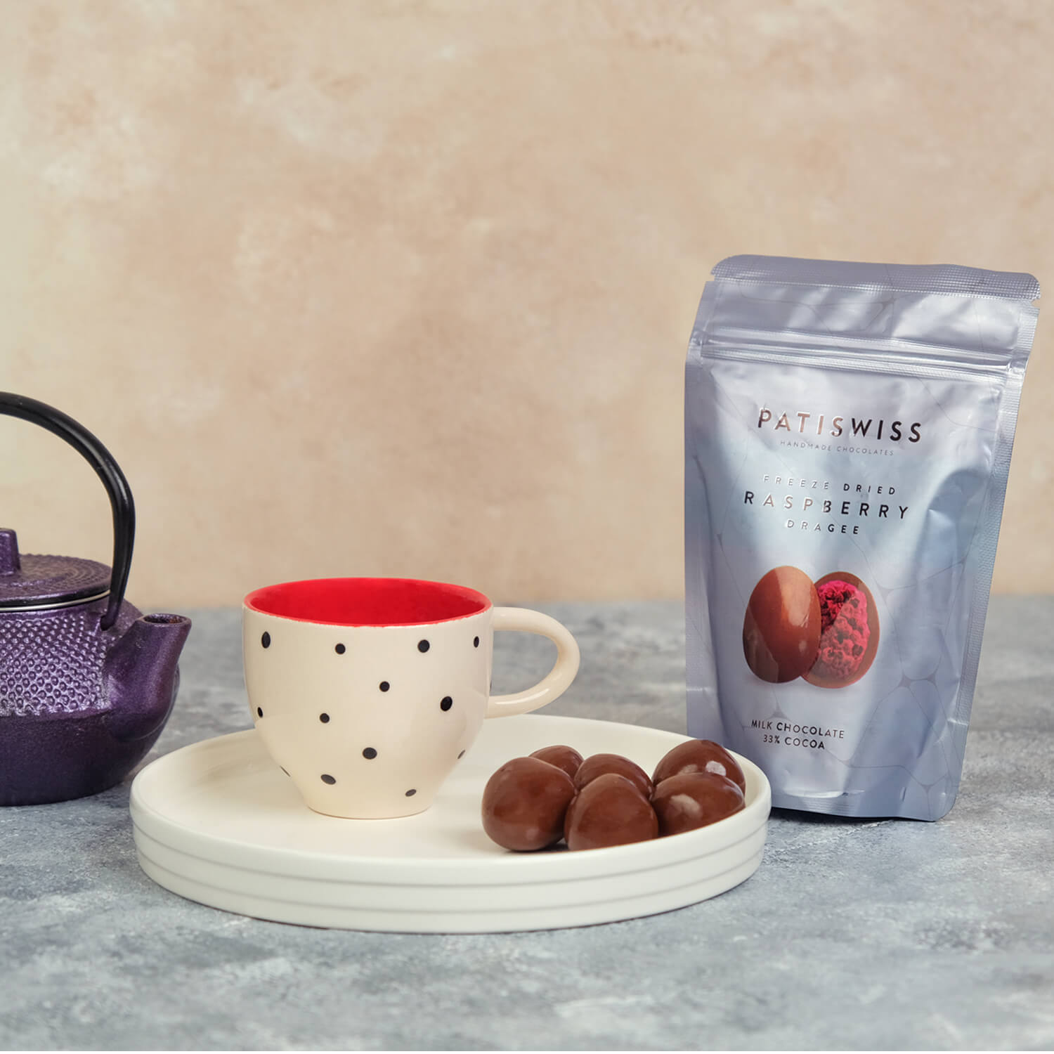 Hiçbir besin değeri kaybolmadan en yüksek teknoloji ile dondurularak kurutulmuş ahududuların, Patiswiss’in %33 kakao oranlı %100 gerçek özel formül çikolataları ile tamamen el yapımı olarak üretilmiş ahududu drajeleri.