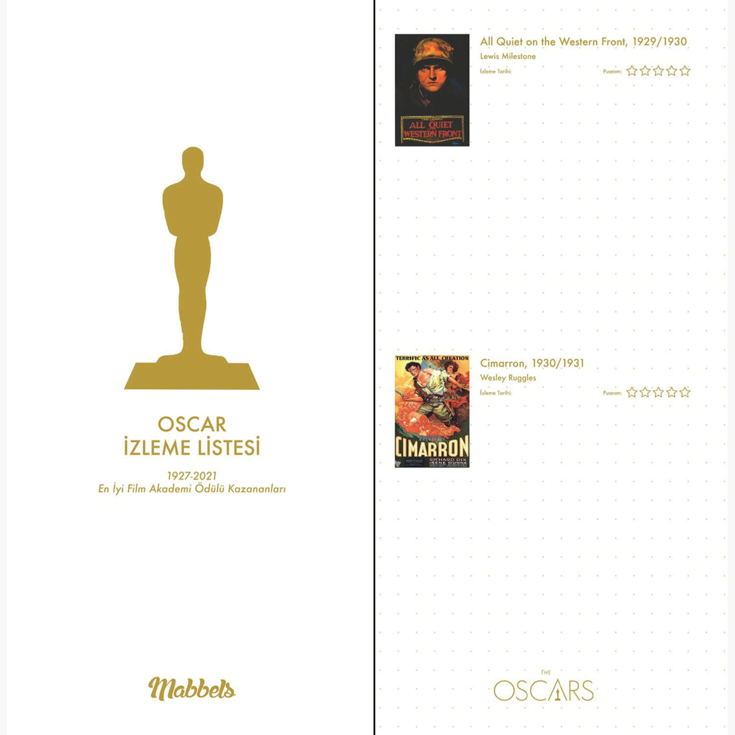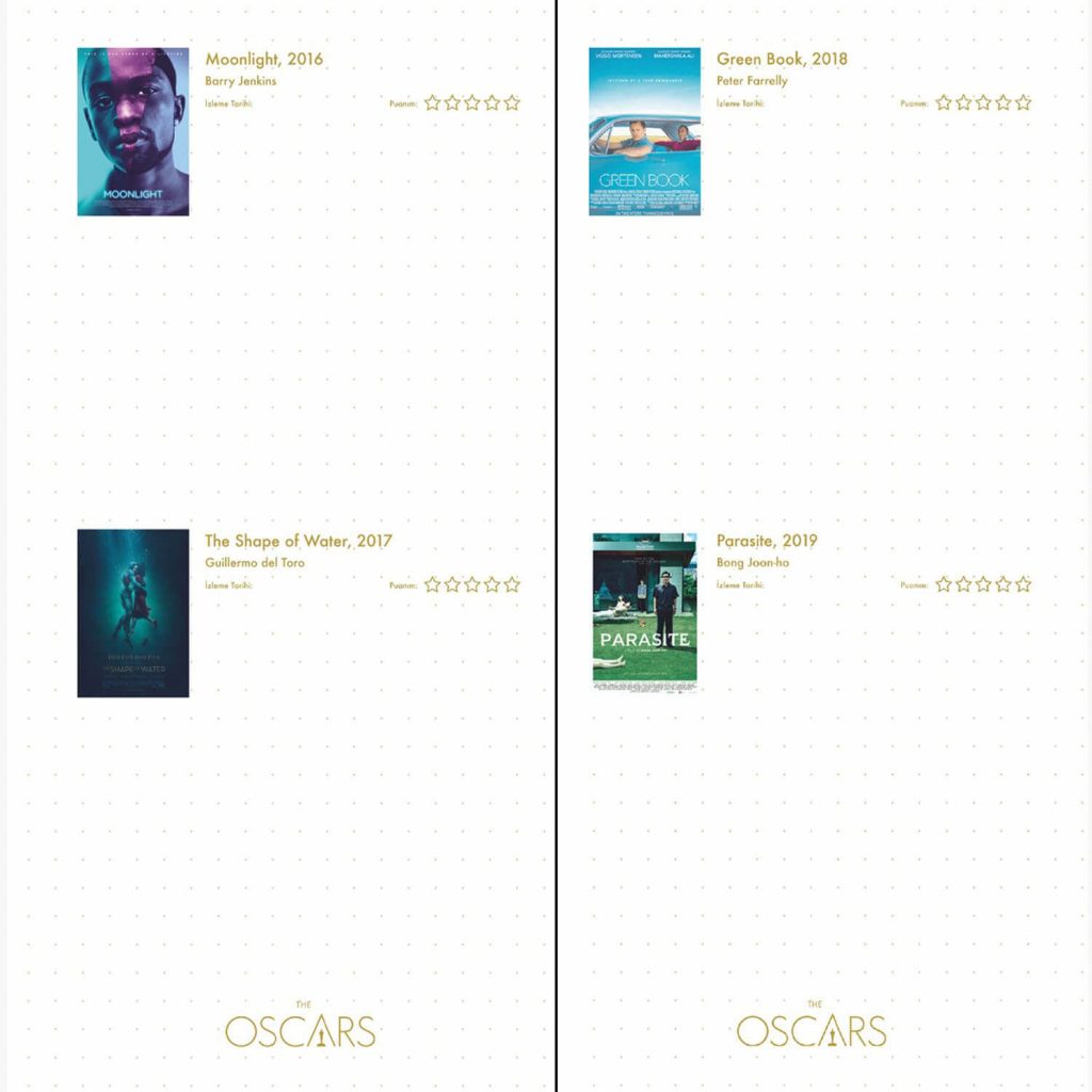 Oscar İzleme Defteri ile 1927-2021 yılları arasında en iyi film ödülünü kazanan tüm filmlerle alakalı görüşlerinizi yazıp puanlarınızı verebileceksiniz. Büyük ödüllü filmlerden kaç tanesini izlediğinizi defterin sonundaki dizinden işaretleyebilirsiniz.